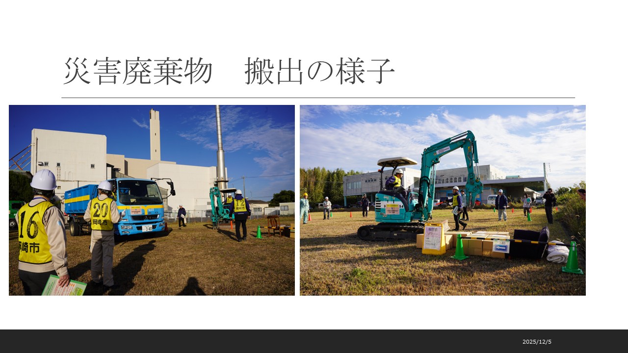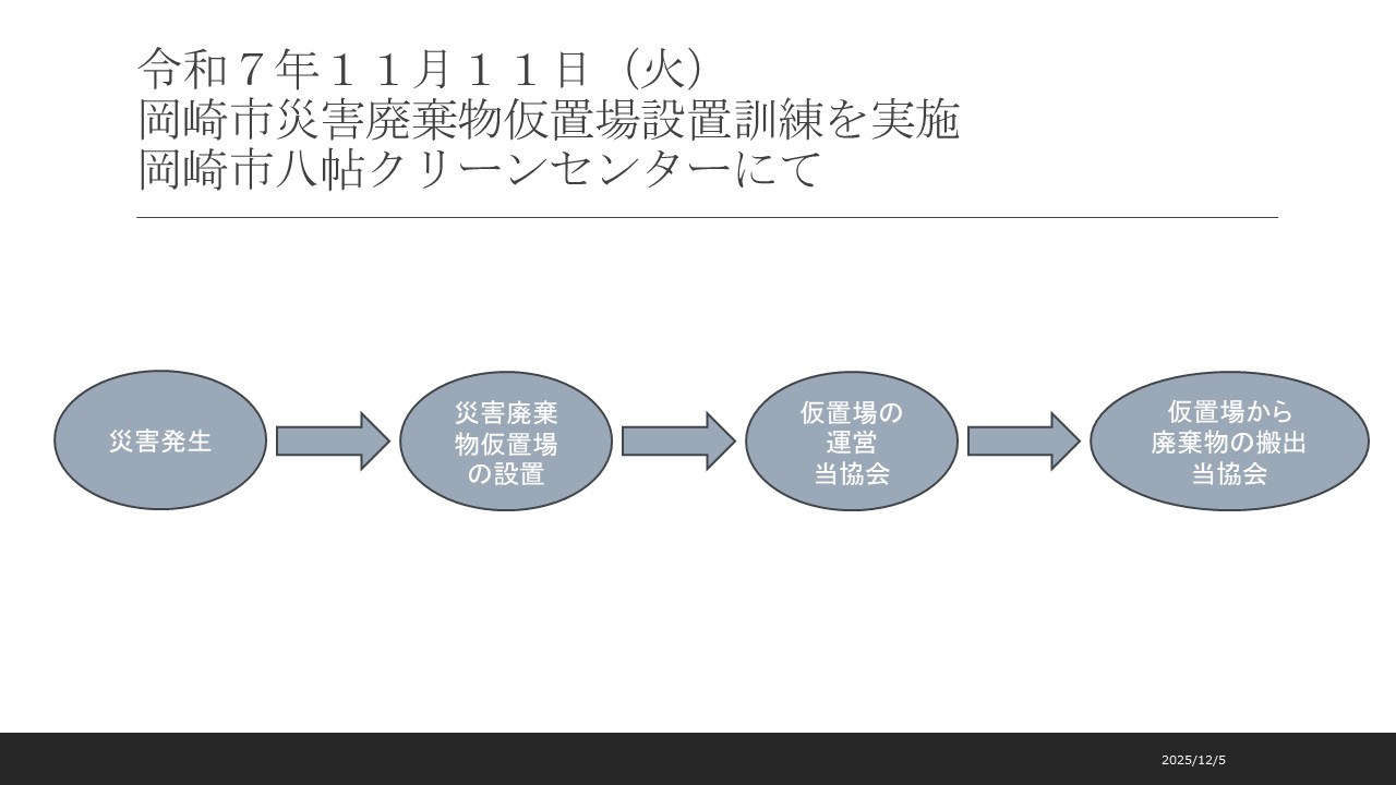 愛知県産業資源循環協会西三河支部、岡崎市主催による災害廃棄物仮置場設置訓練を令和7年11月11日(火)岡崎市八帖クリーンセンターにて実施しました。