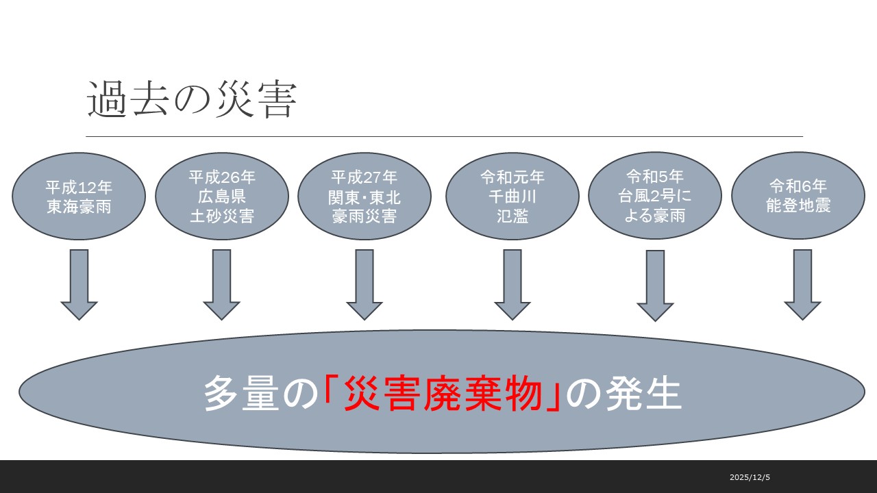 過去に発生した、千曲川の氾濫や令和5年の豊川市水害など、多量に災害廃棄物が発生し、迅速な廃棄物処理が喫緊の課題となっている中、発生時に円滑な処理が早期復興への入口となります。