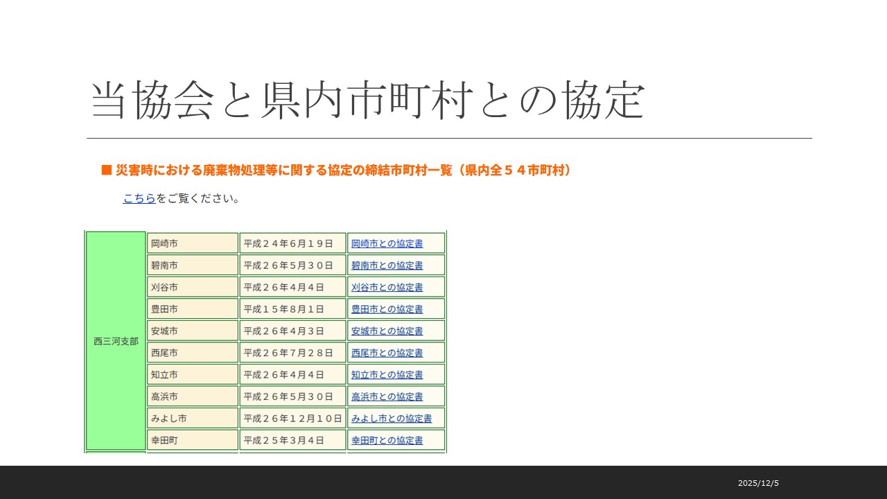 愛知県産業資源循環協会は、県内54市町村と産業廃棄物に関する協定を締結しており、協定書は協会ホームページからも確認可能となっています。